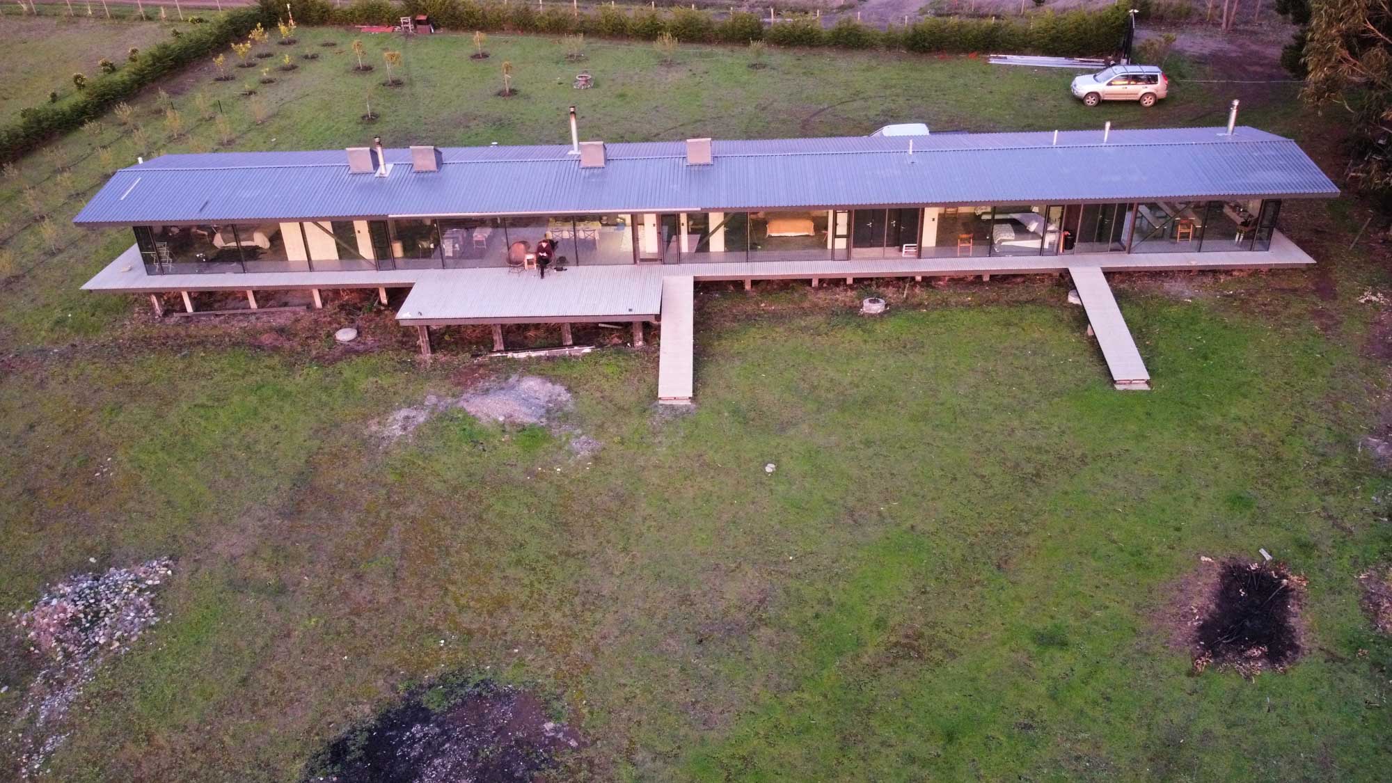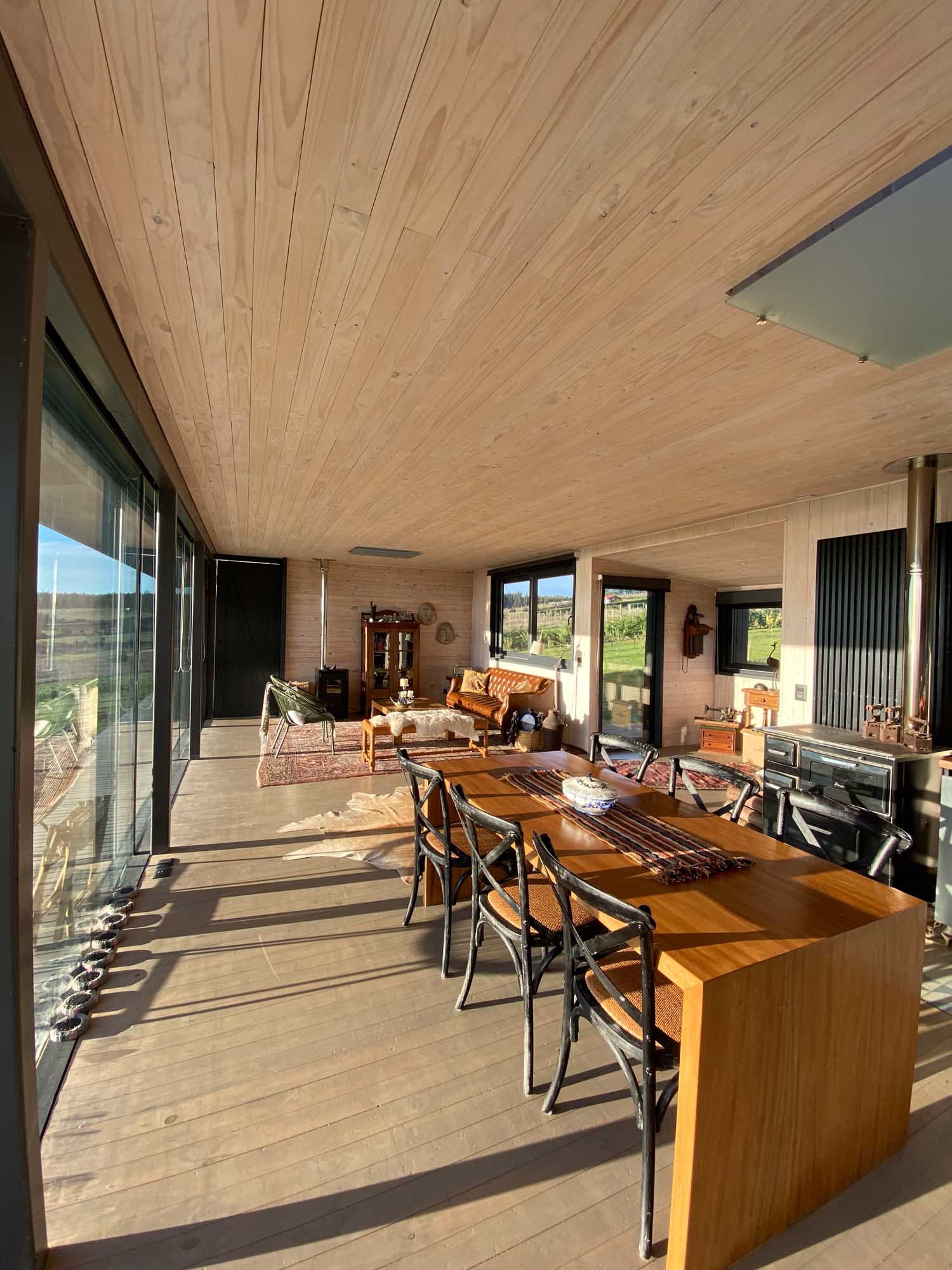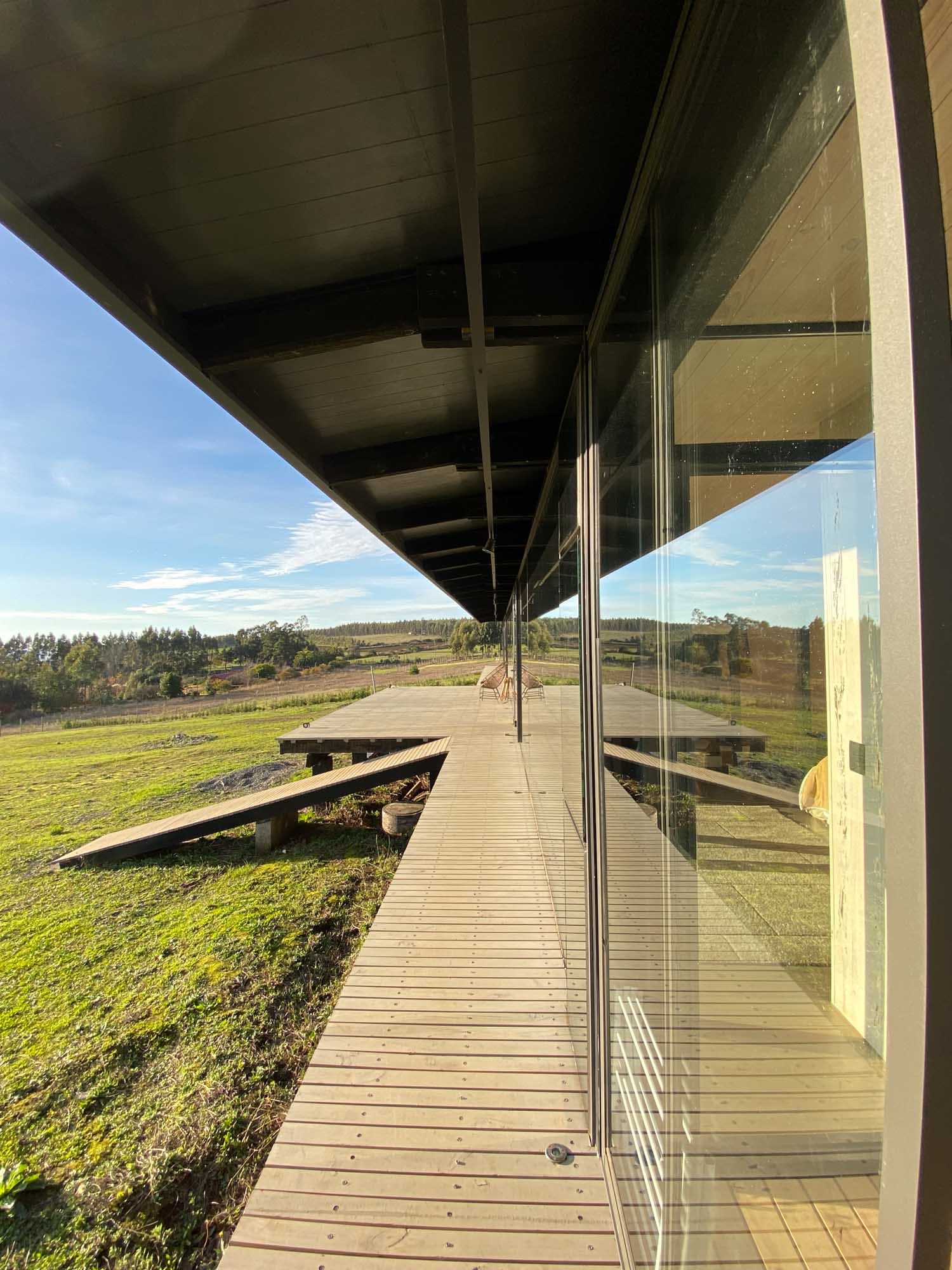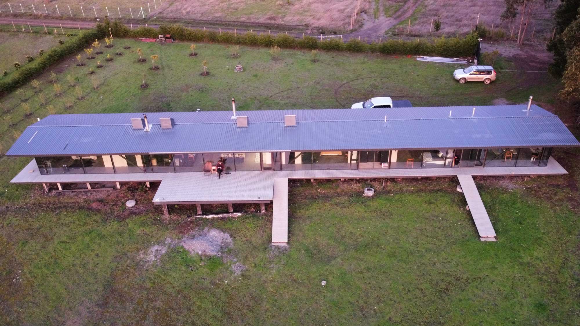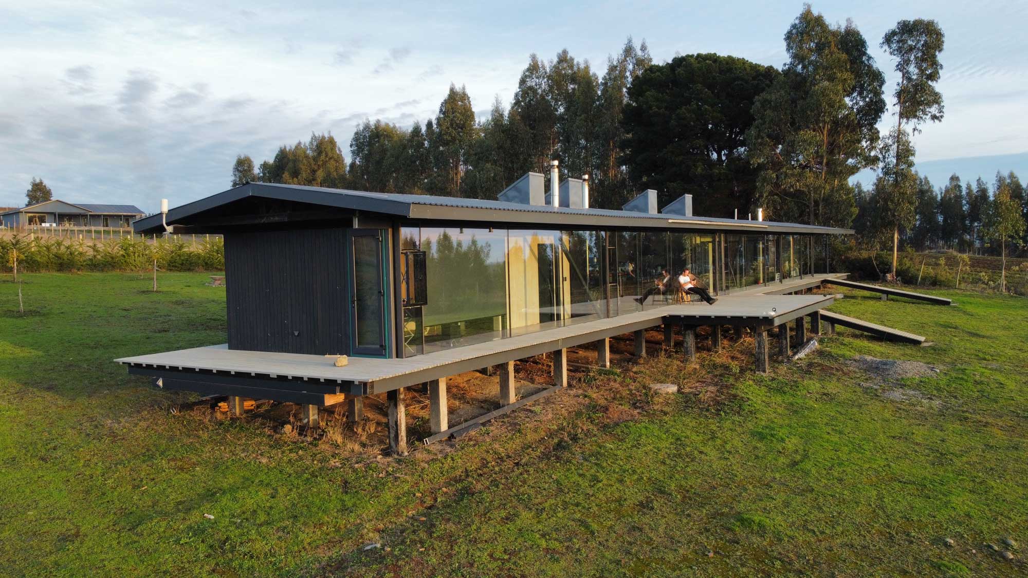 El programa se organiza en las diferentes etapas de producción: almacenamiento, servicios, recepción, producción y venta. El edificio se construye en base a una crujida de 8m x 40m, y fue diseñado como un galpón de madera, relacionado a las construcciones de la zona asociadas a actividades agropecuarias. El uso de madera laminada responde al requisito de adaptabilidad y amplitud del espacio, gracias a esto es posible contar con dimensiones superiores a las comerciales y cubrir así mayores luces. Por último, el revestimiento exterior semitransparente utilizado, aparte de permitir una luminosidad interior homogénea que funciona para el uso diario de taller-exhibición, con iluminación se destaca y se percibe como una marca o hito en el paisaje en el cual está inserto.