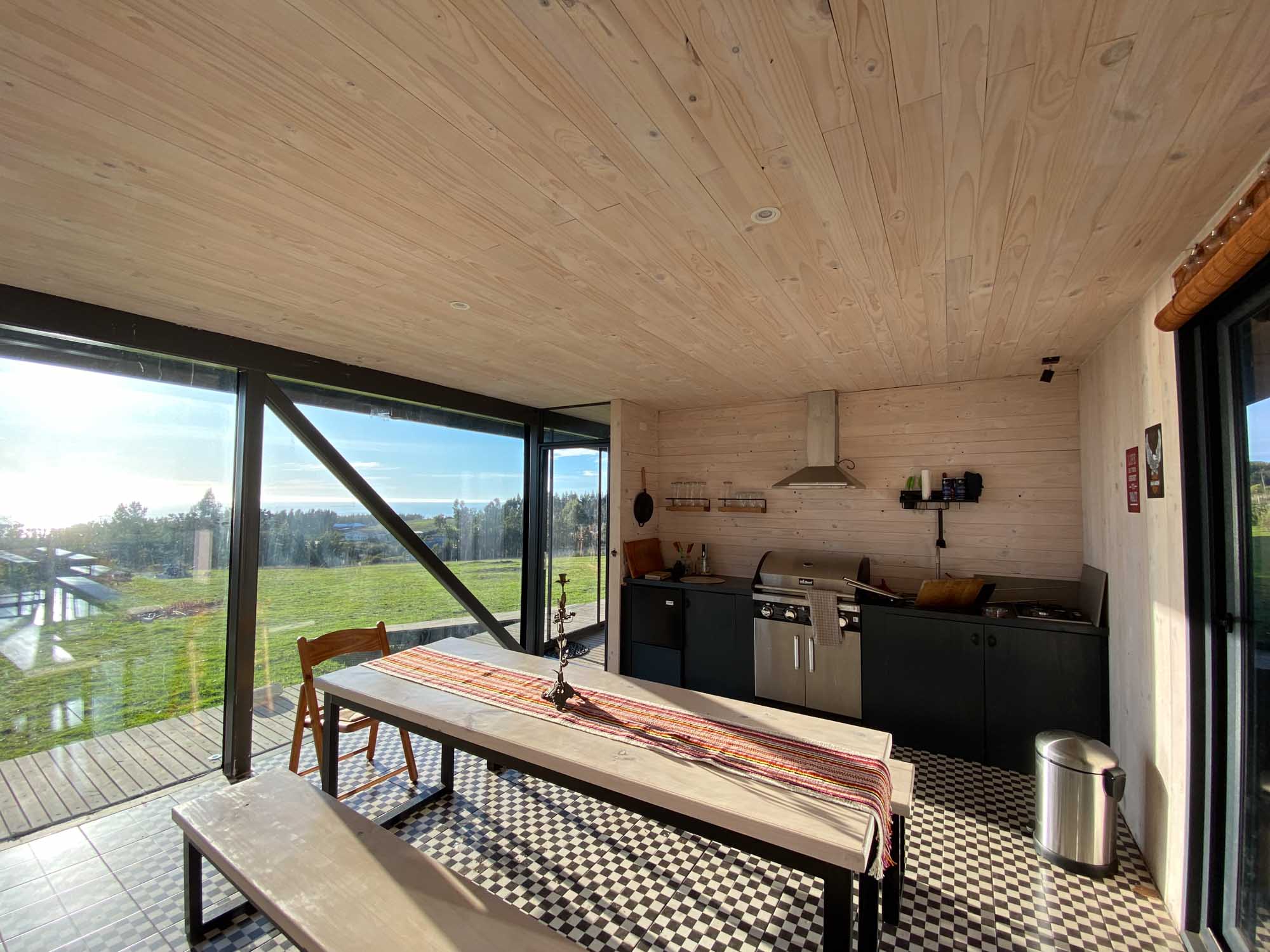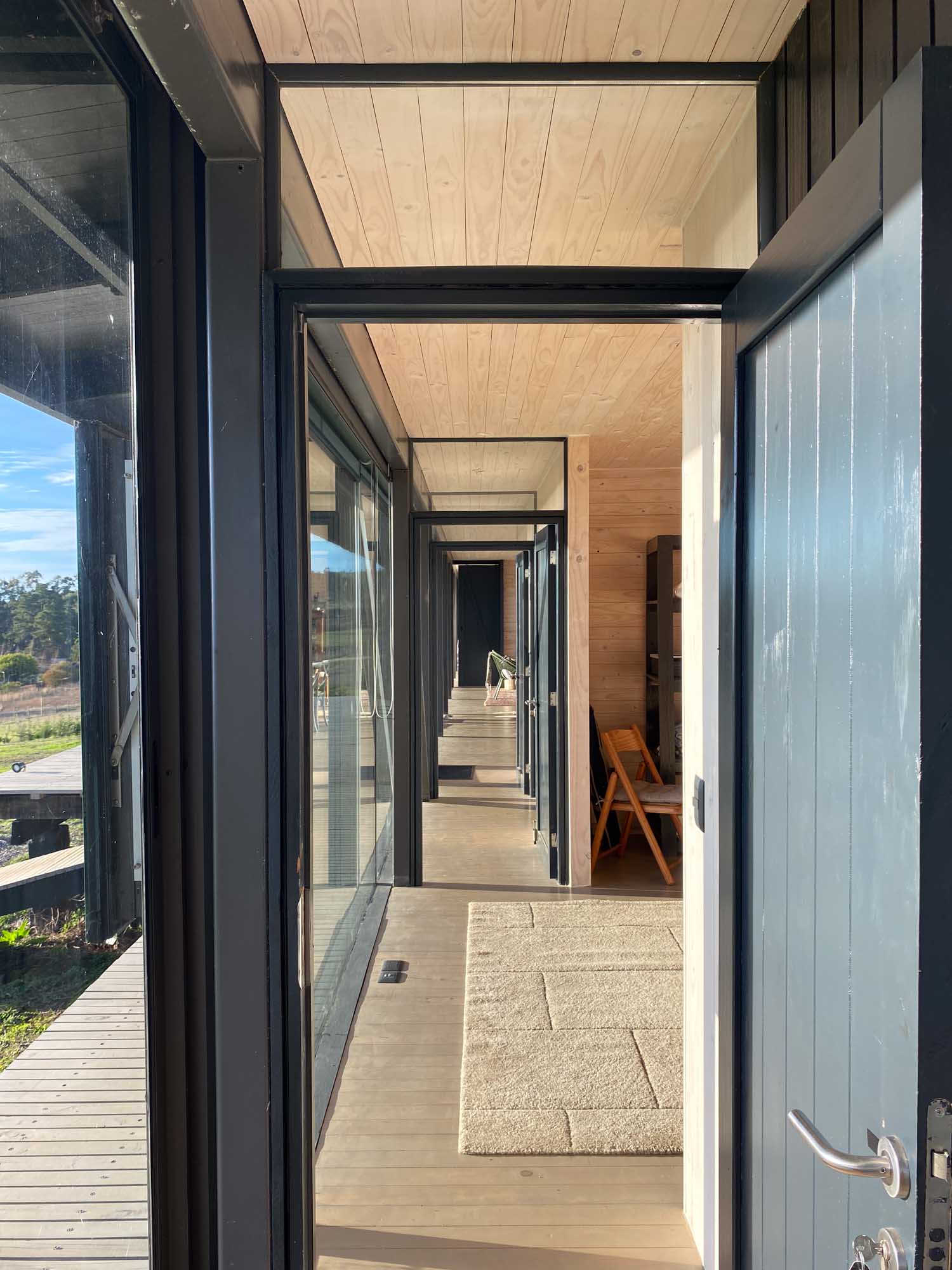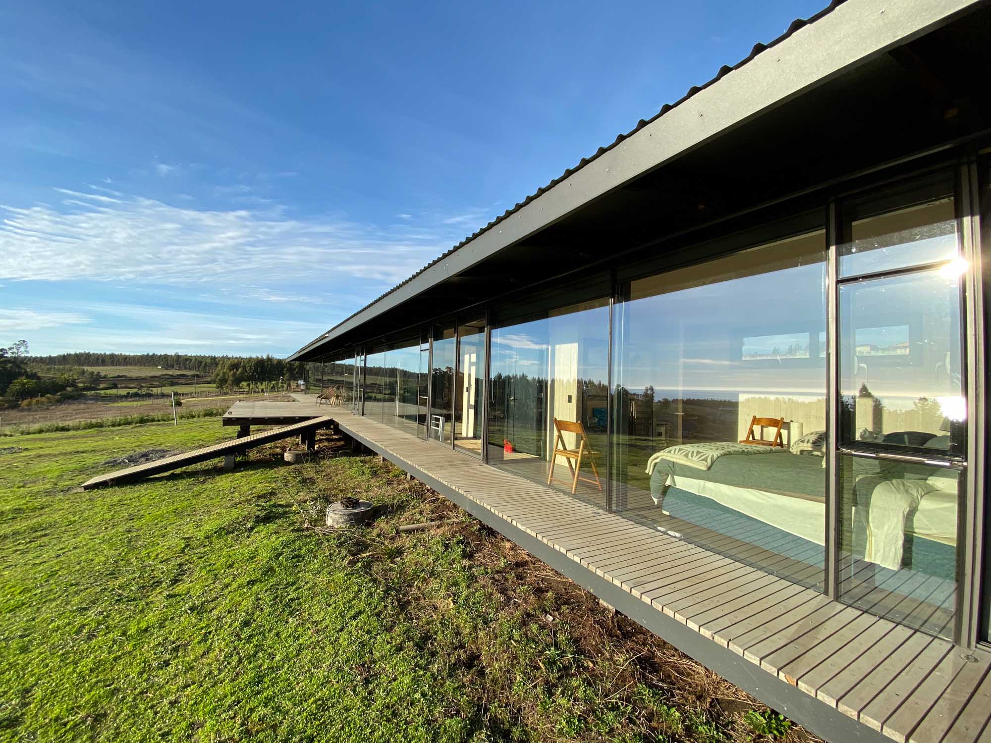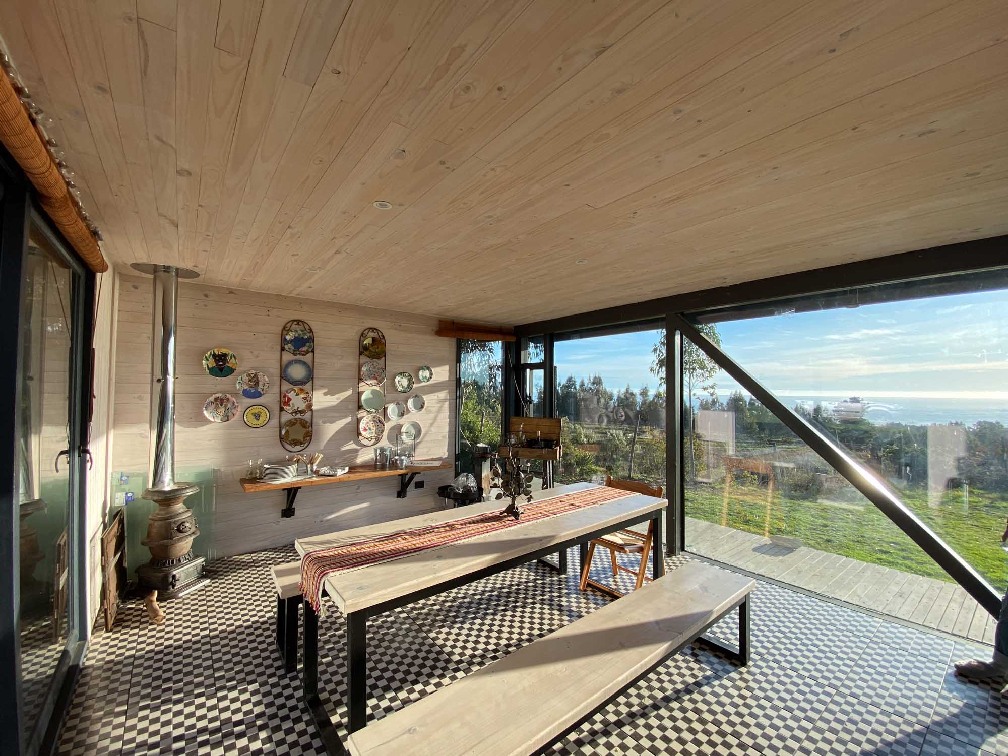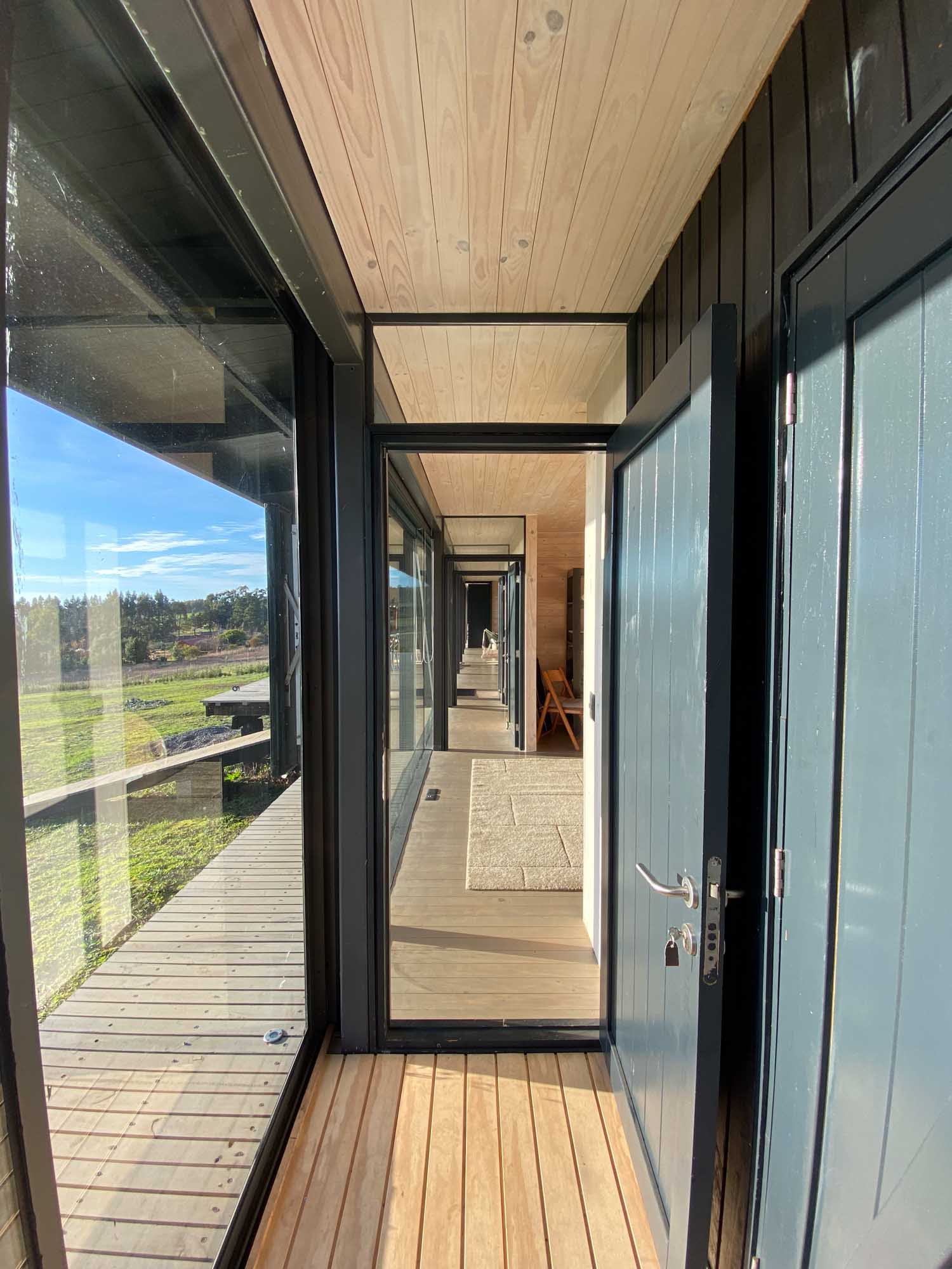 El programa se organiza en las diferentes etapas de producción: almacenamiento, servicios, recepción, producción y venta. El edificio se construye en base a una crujida de 8m x 40m, y fue diseñado como un galpón de madera, relacionado a las construcciones de la zona asociadas a actividades agropecuarias. El uso de madera laminada responde al requisito de adaptabilidad y amplitud del espacio, gracias a esto es posible contar con dimensiones superiores a las comerciales y cubrir así mayores luces. Por último, el revestimiento exterior semitransparente utilizado, aparte de permitir una luminosidad interior homogénea que funciona para el uso diario de taller-exhibición, con iluminación se destaca y se percibe como una marca o hito en el paisaje en el cual está inserto.
